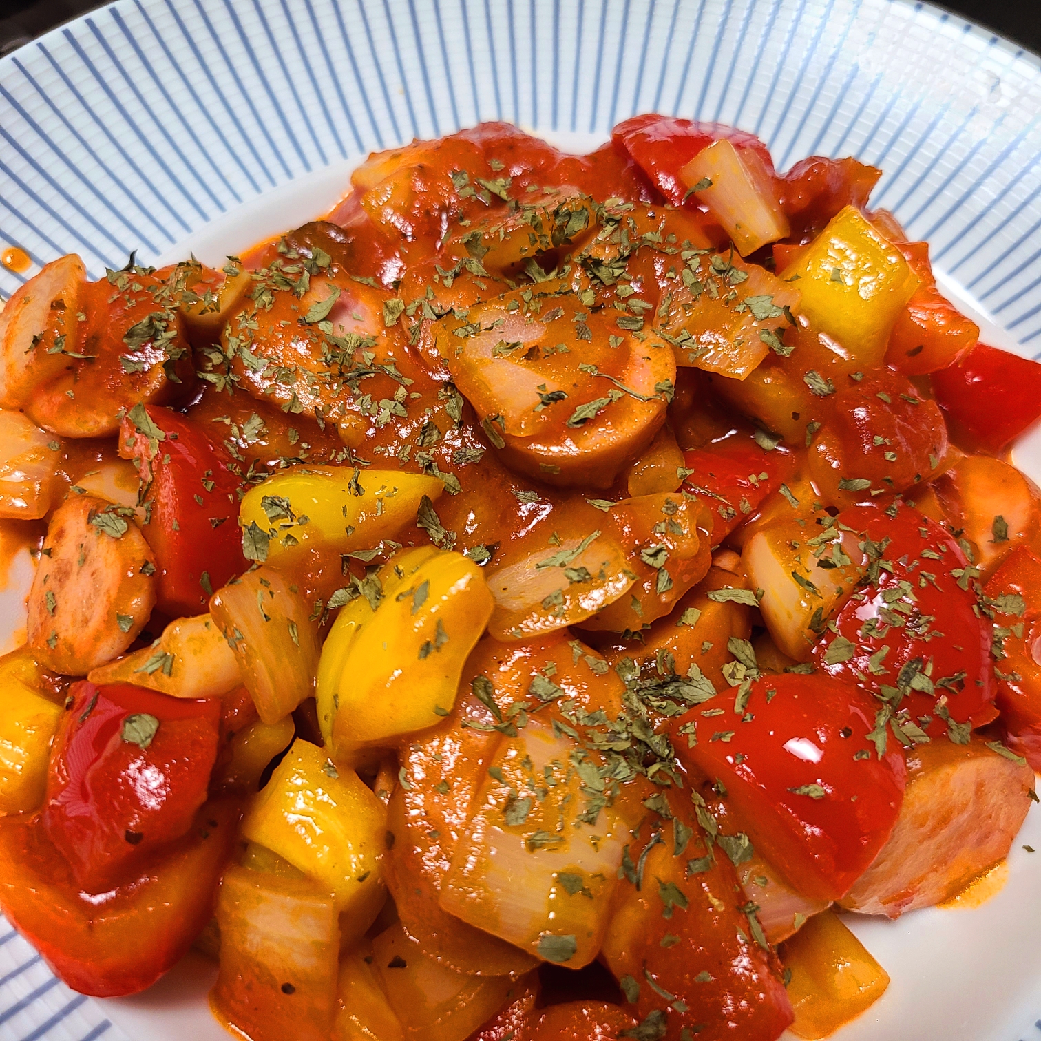 비엔나 소세지와 양파, 피망등을 토마토 소스와 함께 볶아 만든 소세지 야채 볶음이에요.